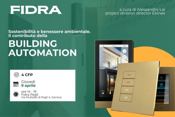 L’incontro Sostenibilità e benessere ambientale. Il contributo della Building Automation (4 CFP) si terrà presso Fidra Pegli, via Multedi di Pegli 4 dalle 14 alle 19 e approfondirà il ruolo sempre più strategico della Building Automation nel migliorare le prestazioni energetiche degli edifici e, allo stesso tempo, la qualità degli ambienti interni e il comfort delle persone che li abitano.